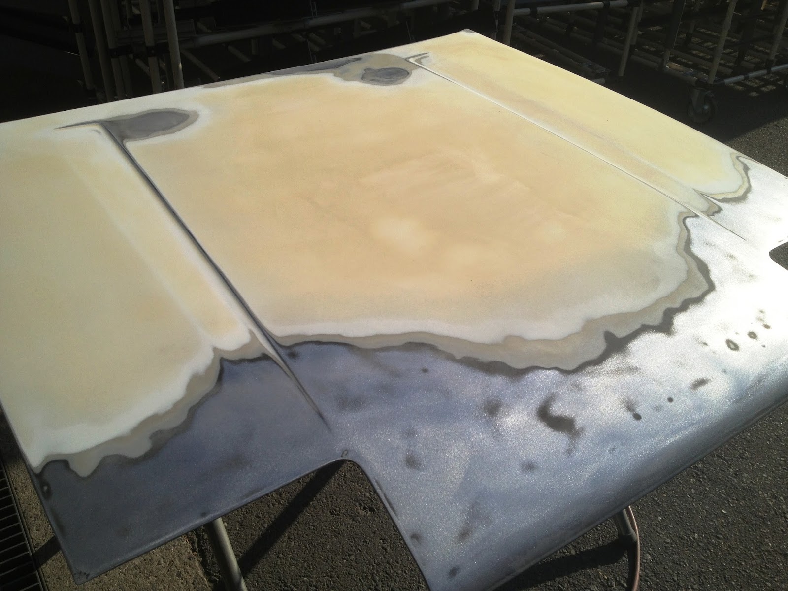 これは今回のボンネットが溶剤塗装である為、パウダーでそのまま塗装を行うと